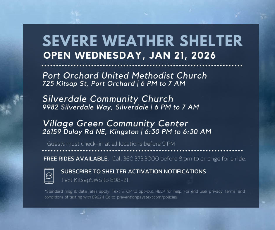 Due to anticipated freezing weather conditions, the Kitsap County Severe Weather Shelters are open Wednesday, January 21, 2025. Hours of operation will be from 6:00 p.m. until 7:00 a.m. except as noted for the Kingston location. Guests will not be able to check into the shelter after 9:00 p.m. If no guests have checked into a shelter location by 9:00 p.m., that location will close for the evening.
